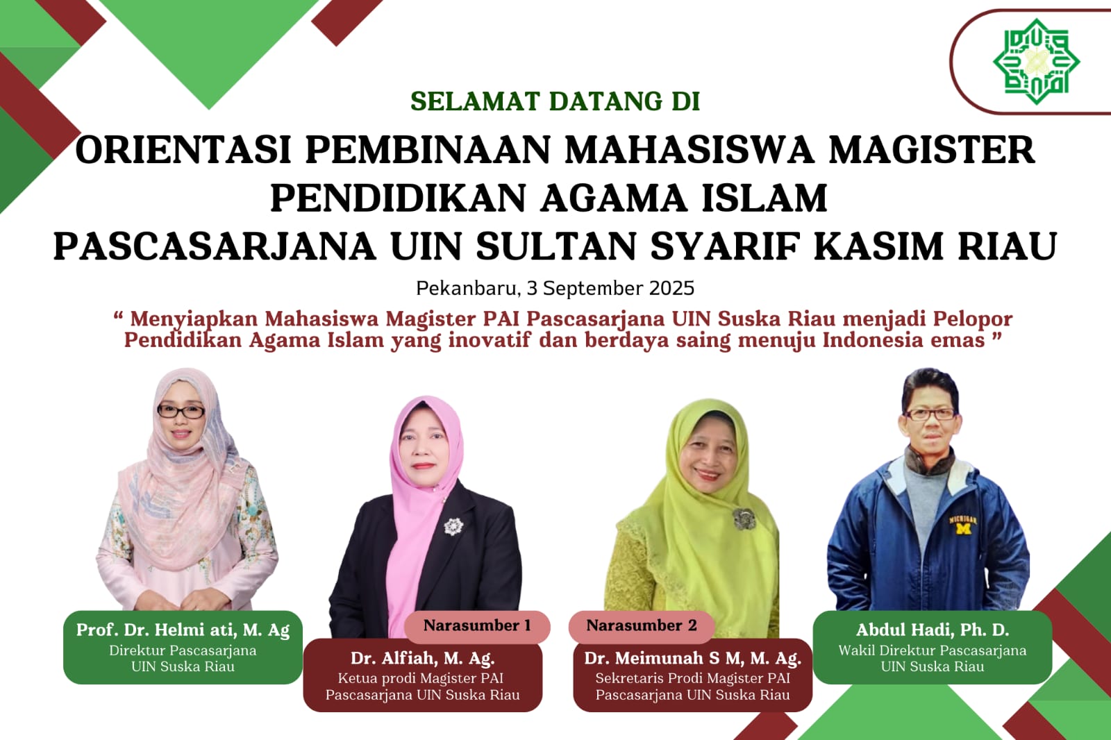 Program Studi Magister Pendidikan Agama Islam (MPAI) Pascasarjana Universitas Islam Negeri Sultan Syarif Kasim (UIN) Suska Riau menyelenggarakan kegiatan Orientasi Pembinaan Mahasiswa Baru Tahun 2025 pada Rabu, 3 September 2025. Acara yang berlangsung di Aula Pascasarjana UIN Suska Riau ini mengusung tema “Menyiapkan Mahasiswa Magister PAI Pascasarjana UIN Suska Riau Menjadi Pelopor Pendidikan Agama Islam yang Inovatif dan Berdaya Saing Menuju Indonesia Emas”.