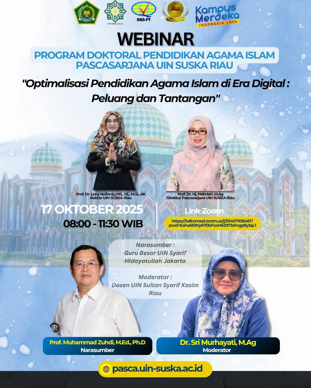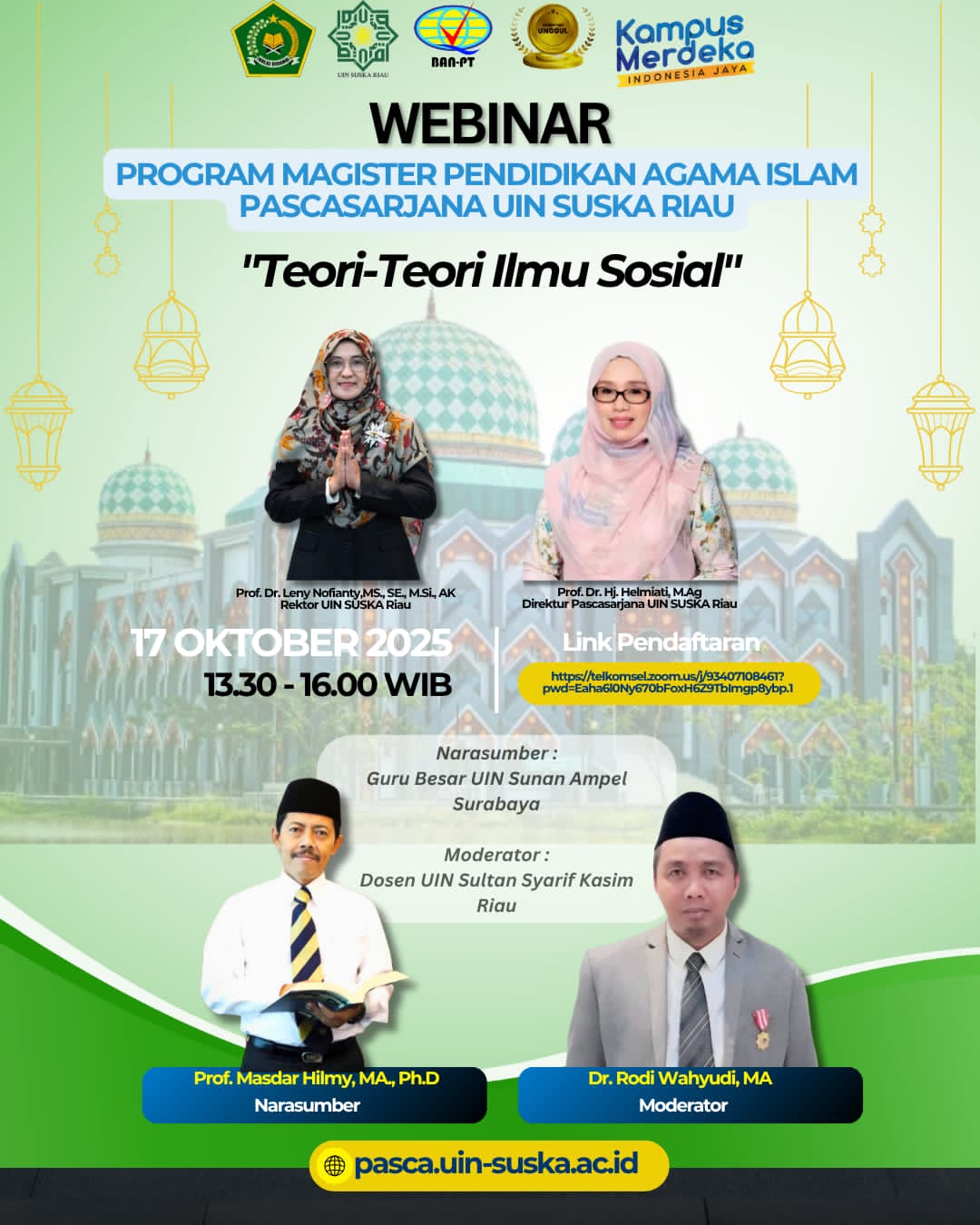 Program Magister Pendidikan Agama Islam (MPAI) Pascasarjana Universitas Islam Negeri Sultan Syarif Kasim (UIN) Suska Riau mengadakan Webinar Nasional bertema “Teori-Teori Ilmu Sosial” pada Kamis, 17 Oktober 2025, pukul 13.30–16.00 WIB secara hybrid, narasumber beserta pimpinan pascasarjana secara offline dan peserta secara online melalui platform Zoom Meeting. Kegiatan ini dibuka secara resmi oleh Direktur Pascasarjana UIN Suska...Read More