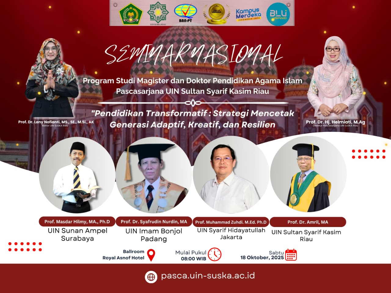 Program Studi Magister dan Doktor Pendidikan Agama Islam (PAI) Pascasarjana Universitas Islam Negeri Sultan Syarif Kasim (UIN) Suska Riau menyelenggarakan Seminar Nasional bertema “Pendidikan Transformatif: Strategi Mencetak Generasi Adaptif, Kreatif, dan Resilien” pada Sabtu, 18 Oktober 2025, bertempat di Ballroom Royal Asnof Hotel, Pekanbaru, mulai pukul 08.00 WIB hingga pukul 17.00 WIB. Kegiatan ini dibuka...Read More
