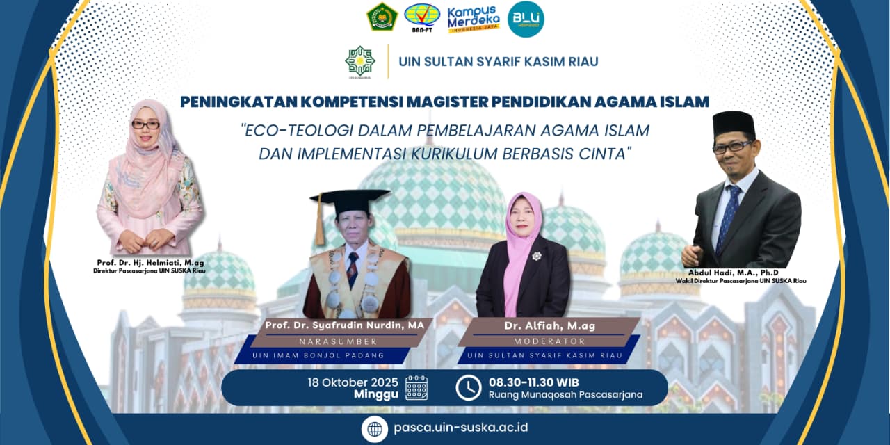 Program Magister Pendidikan Agama Islam (PAI) Pascasarjana Universitas Islam Negeri Sultan Syarif Kasim (UIN) Suska Riau menyelenggarakan webinar nasional bertajuk “Optimalisasi Pendidikan Agama Islam di Era Digital: Peluang dan Tantangan” pada Kamis, 17 Oktober 2025, secara hybrid dengan narasumber di Kampus Pascasarjana UIN Suska Riau serta peserta secara online melalui Zoom Meeting. Kegiatan ini...Read More