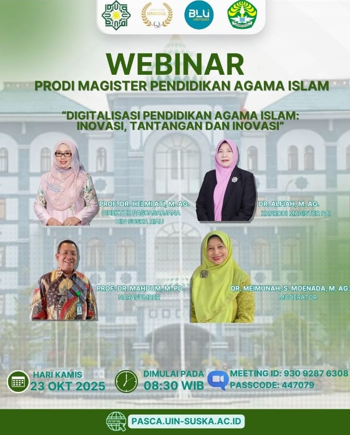Pekanbaru, 26 Oktober 2025 – Program Studi Magister Pendidikan Agama Islam (PAI) Pascasarjana UIN Sultan Syarif Kasim Riau kembali mengadakan kegiatan ilmiah berupa webinar akademik writting dengan tema “Menembus Jurnal Terakreditasi dan Bereputasi: Teknik, Strategi, dan Konsistensi Akademik bagi Dosen dan Mahasiswa Magister PAI.” Kegiatan ini digelar secara daring melalui Zoom Meeting pada Ahad pagi...Read More