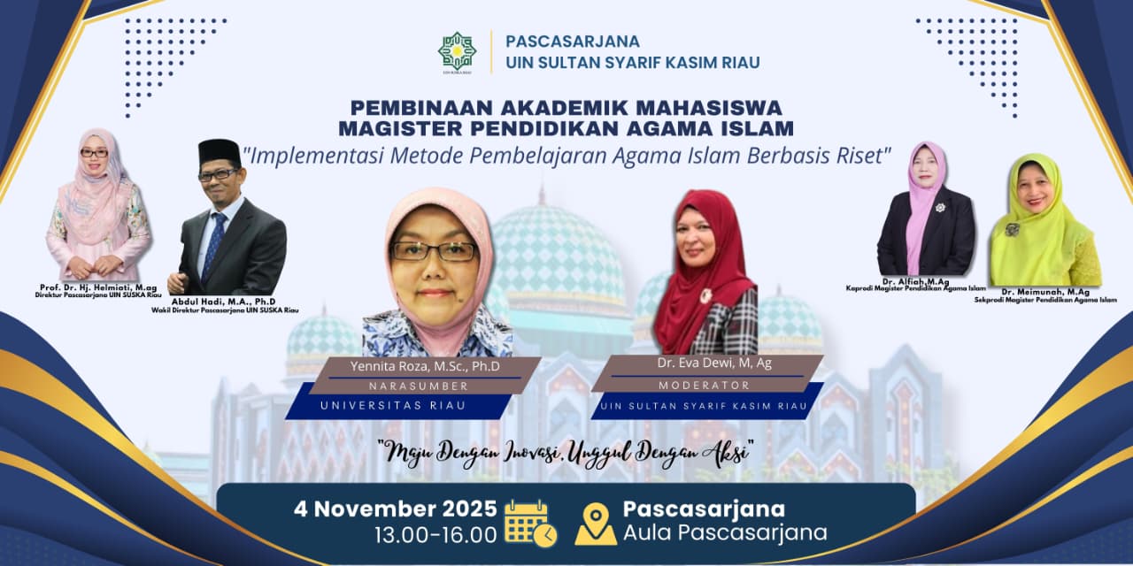 Pekanbaru, 4 November 2025 – Program Studi Magister Pendidikan Agama Islam, Pascasarjana UIN Sultan Syarif Kasim Riau, menyelenggarakan kegiatan Pembinaan Akademik Mahasiswa dengan tema “Implementasi Metode Pembelajaran Agama Islam Berbasis Riset”. Acara ini berlangsung pada Selasa, 4 November 2025, bertempat di Aula Pascasarjana, mulai pukul 13.00–16.00 WIB. Kegiatan ini merupakan bagian dari agenda rutin akademik...