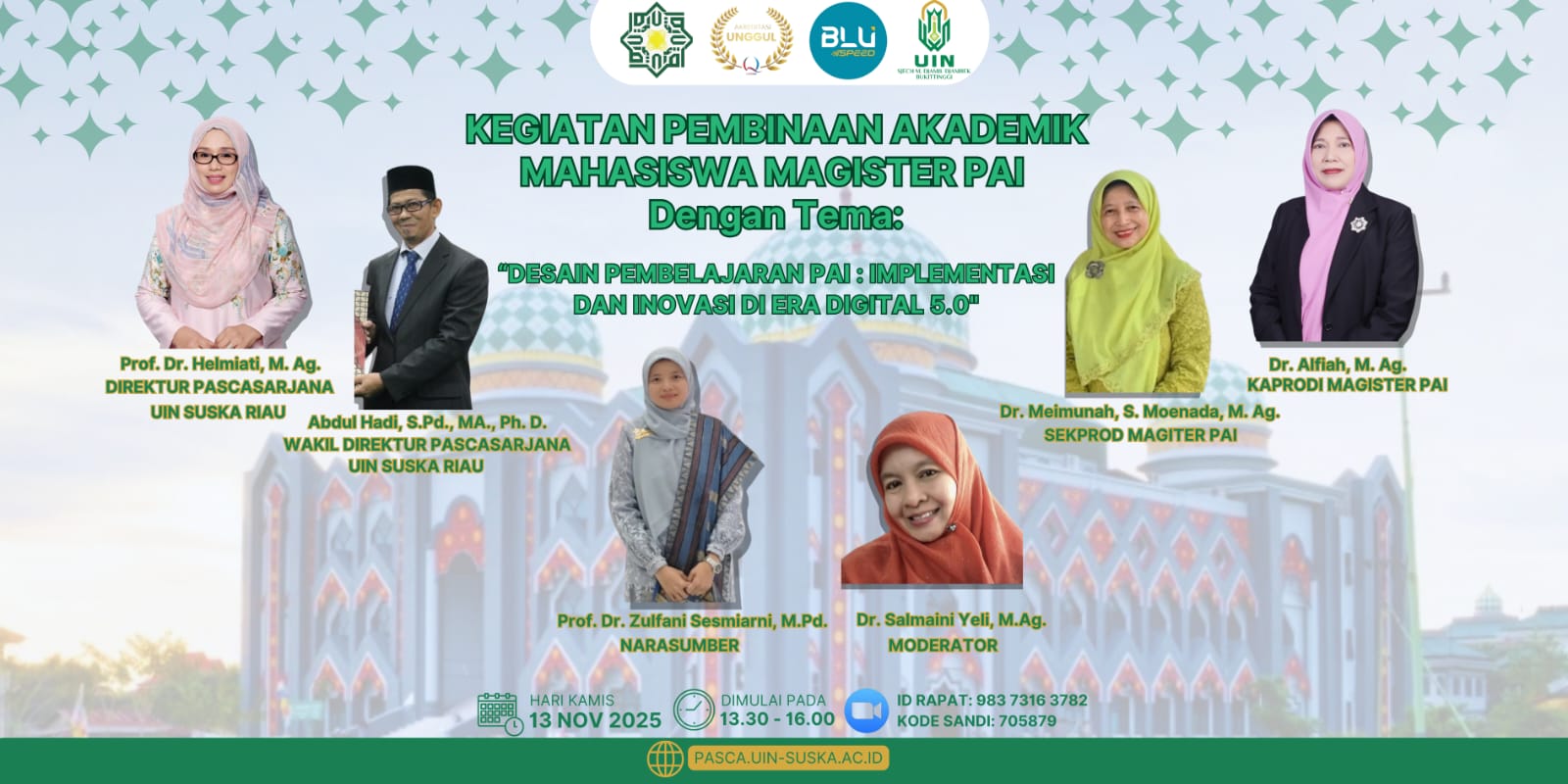 Pekanbaru, 26 Oktober 2025 – Program Studi Magister Pendidikan Agama Islam (PAI) Pascasarjana UIN Sultan Syarif Kasim Riau kembali mengadakan kegiatan ilmiah berupa webinar akademik writting dengan tema “Menembus Jurnal Terakreditasi dan Bereputasi: Teknik, Strategi, dan Konsistensi Akademik bagi Dosen dan Mahasiswa Magister PAI.” Kegiatan ini digelar secara daring melalui Zoom Meeting pada Ahad pagi...